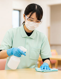 スタンダード・プリコーション(標準予防策)マニュアルを徹底しています。現在の新型コロナウィルス対策はもちろん、様々な感染症の予防に取り組んでいます。この取り組みは清潔感のある気持ちの良いサービスにも繋がっている、と考えます。